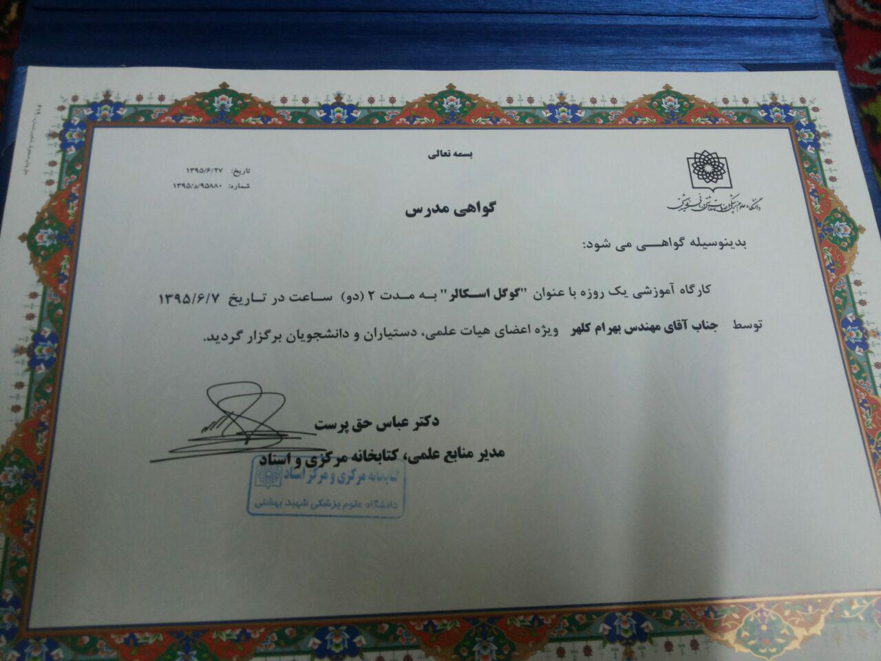 | سخنرانی در دانشگاه علوم پزشکی شهید بهشتی | برگزاری کارگاه گوگل اسکالر در دانشگاه علوم پزشکی شهید بهشتی | برگزاری کارگاه وبومتریکس در دانشگاه علوم پزشکی شهید بهشتی |